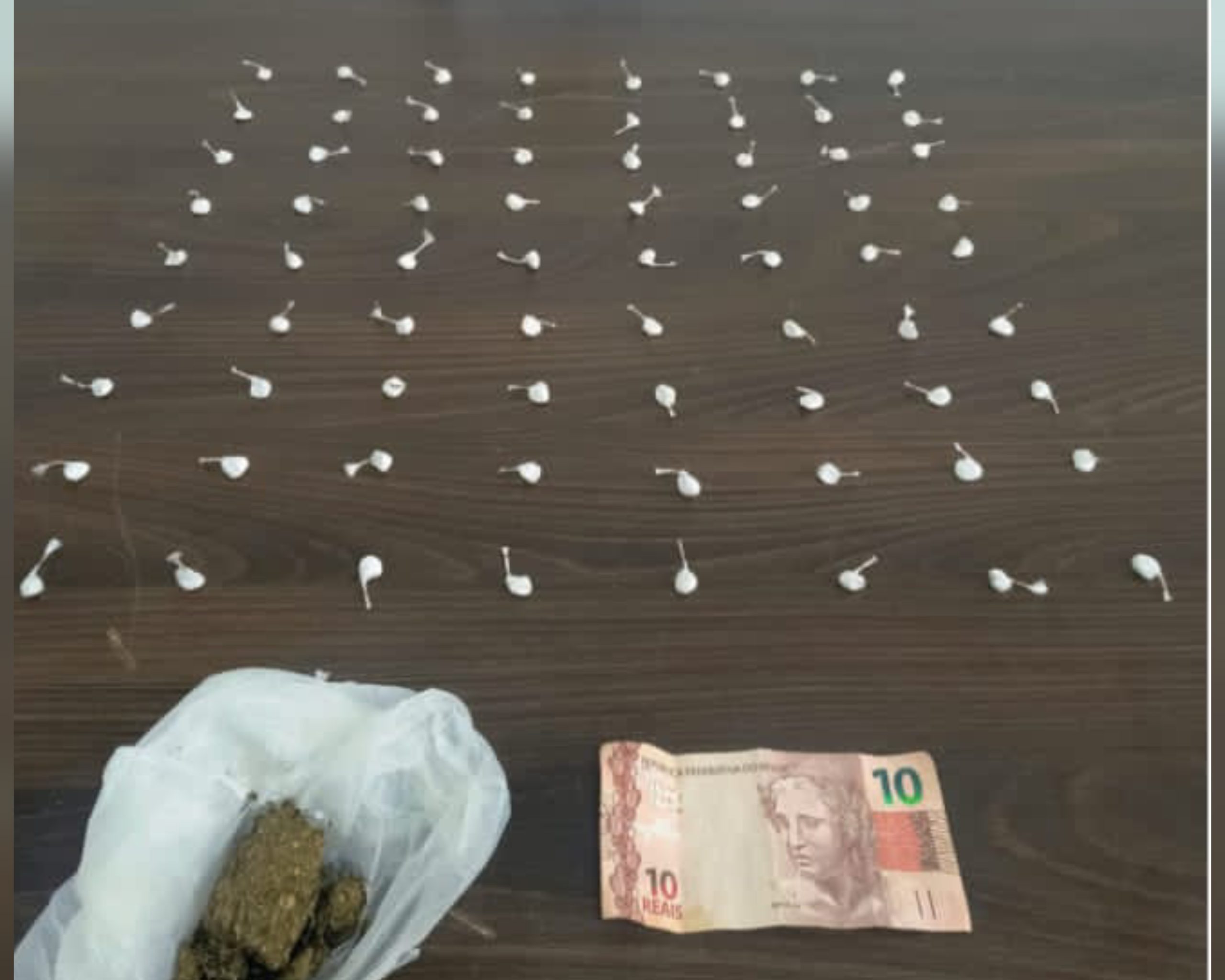 Os policiais seguiram até o endereço indicado e localizaram o homem, a motocicleta e uma mulher que seria proprietária da residência. Durante as buscas, foram encontradas 72 buchas de cocaína — parte delas nos bolsos do suspeito e o restante dentro da casa — além de uma porção de maconha sobre uma mesa e R$10,00 em dinheiro.