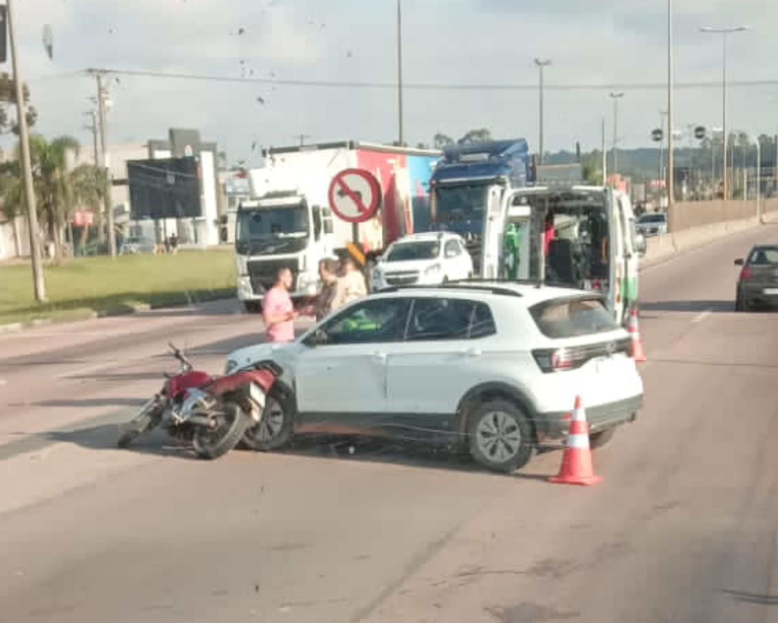 O primeiro acidente foi registrado no km 124 da BR-116, em frente à empresa Plastilit. Um motociclista ficou ferido após se envolver em uma colisão. Ele recebeu os primeiros atendimentos ainda no local e, em seguida, foi encaminhado ao Hospital do Trabalhador para avaliação médica.