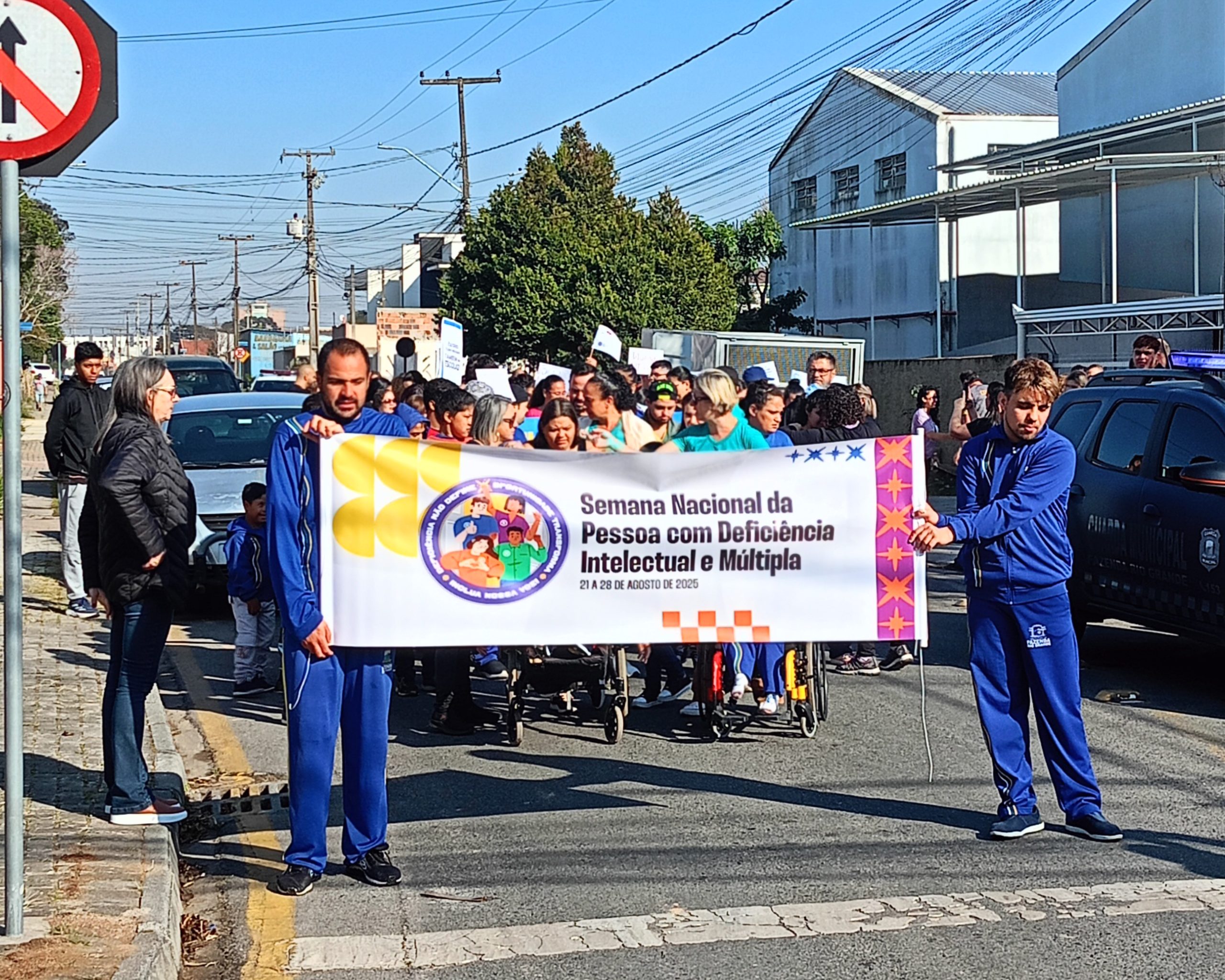 A APAE de Fazenda Rio Grande promoveu, na manhã desta quinta-feira (21), uma caminhada em parte da Avenida Brasil, com destino à prefeitura, em referência à Semana Nacional da Pessoa com Deficiência Intelectual e Múltipla. O evento reuniu alunos, familiares, profissionais da instituição, voluntários e apoiadores da causa, com o objetivo de conscientizar a população sobre a importância da inclusão e da defesa dos direitos das pessoas com deficiência.
