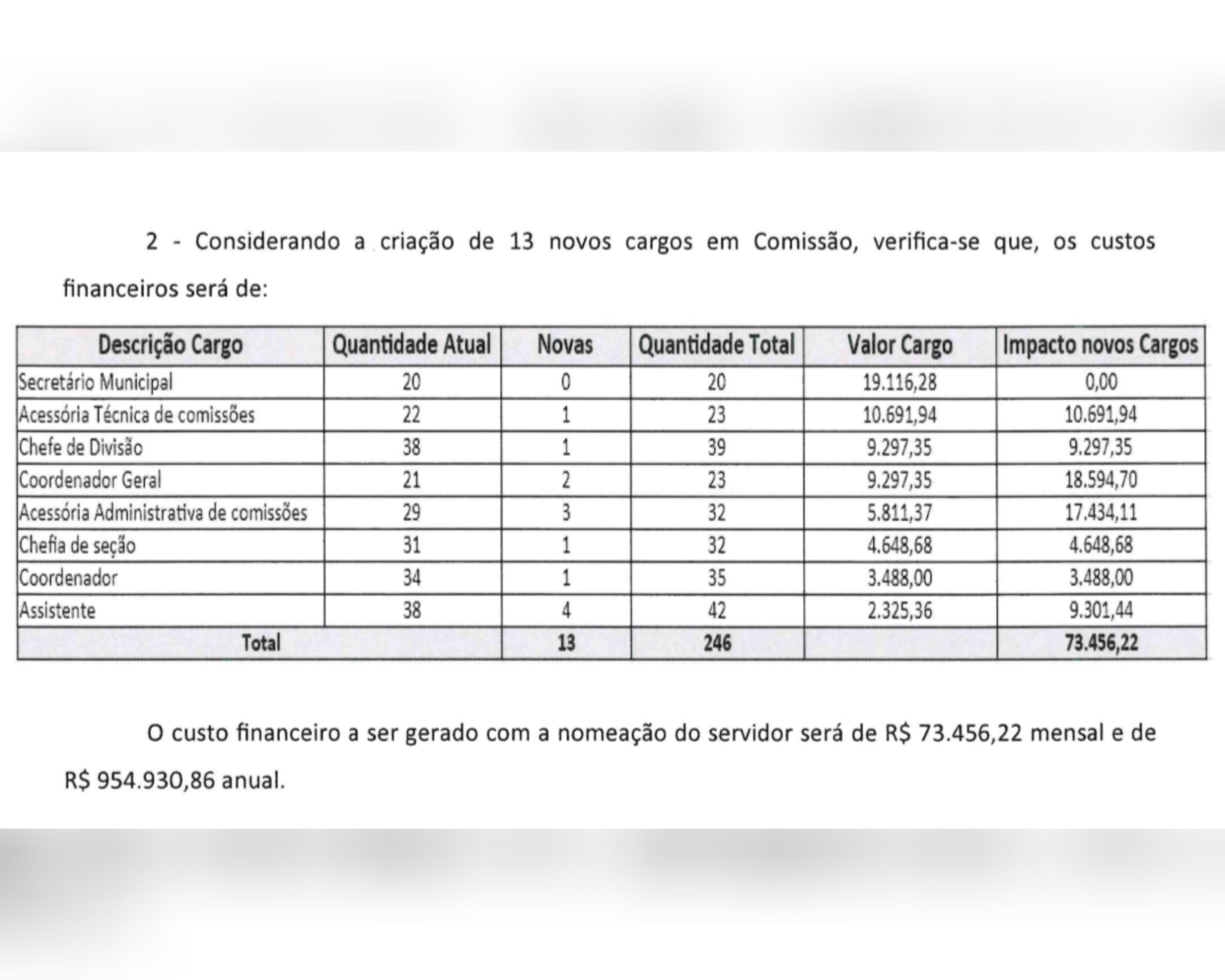 No impacto anual, o custo estimado da nova estrutura chega a R$ 13.131.955,85, valor superior ao atualmente praticado, ampliando de forma expressiva a despesa com pessoal em cargos de confiança.