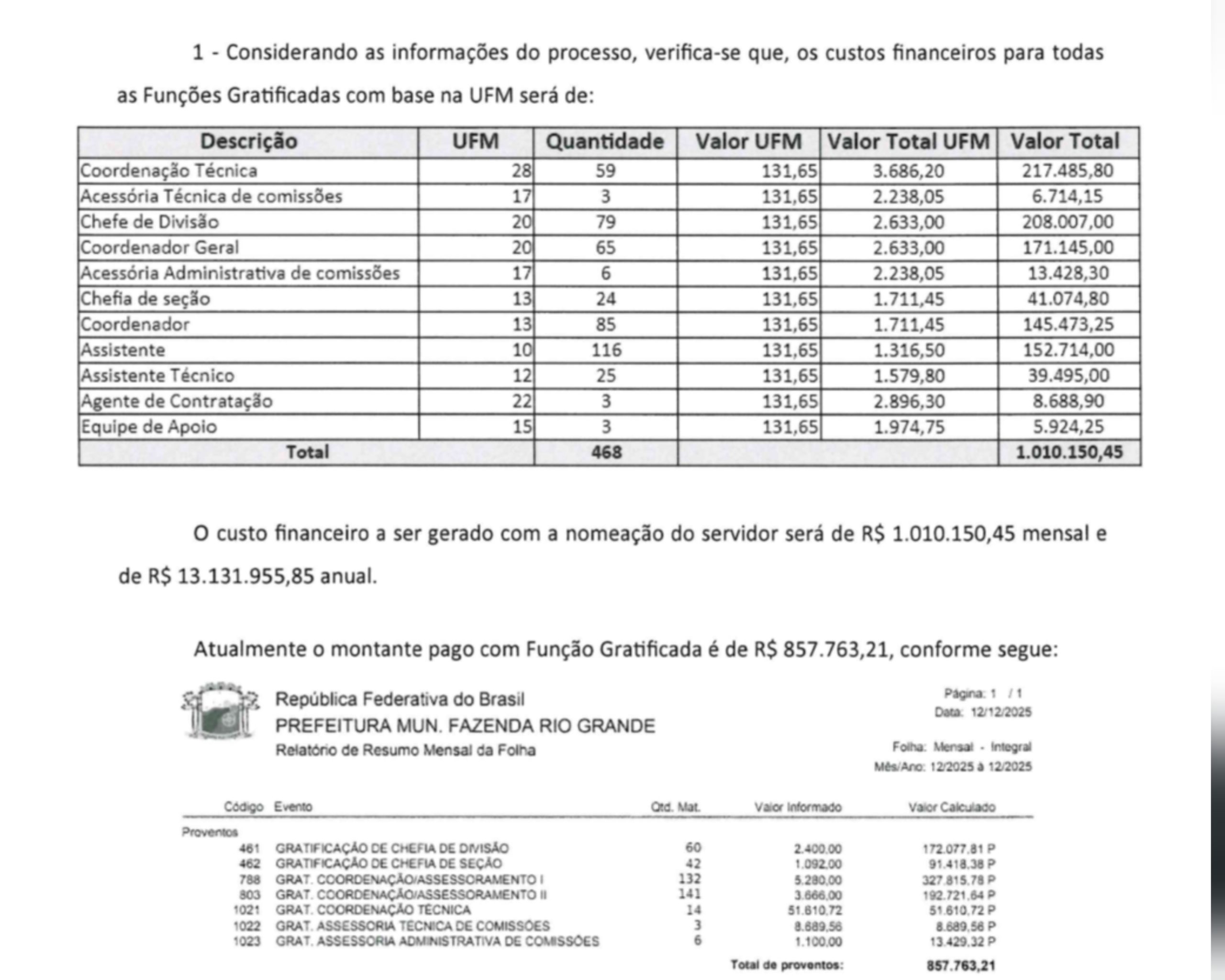De acordo com os dados apresentados no projeto, a mudança provoca um aumento significativo nos gastos mensais com Funções Gratificadas. Atualmente, o custo mensal das funções é de R$ 857.763,21. Com a nova metodologia de cálculo, o valor passa para R$ 1.010.150,45, o que representa um aumento de R$ 152.387,24 por mês.