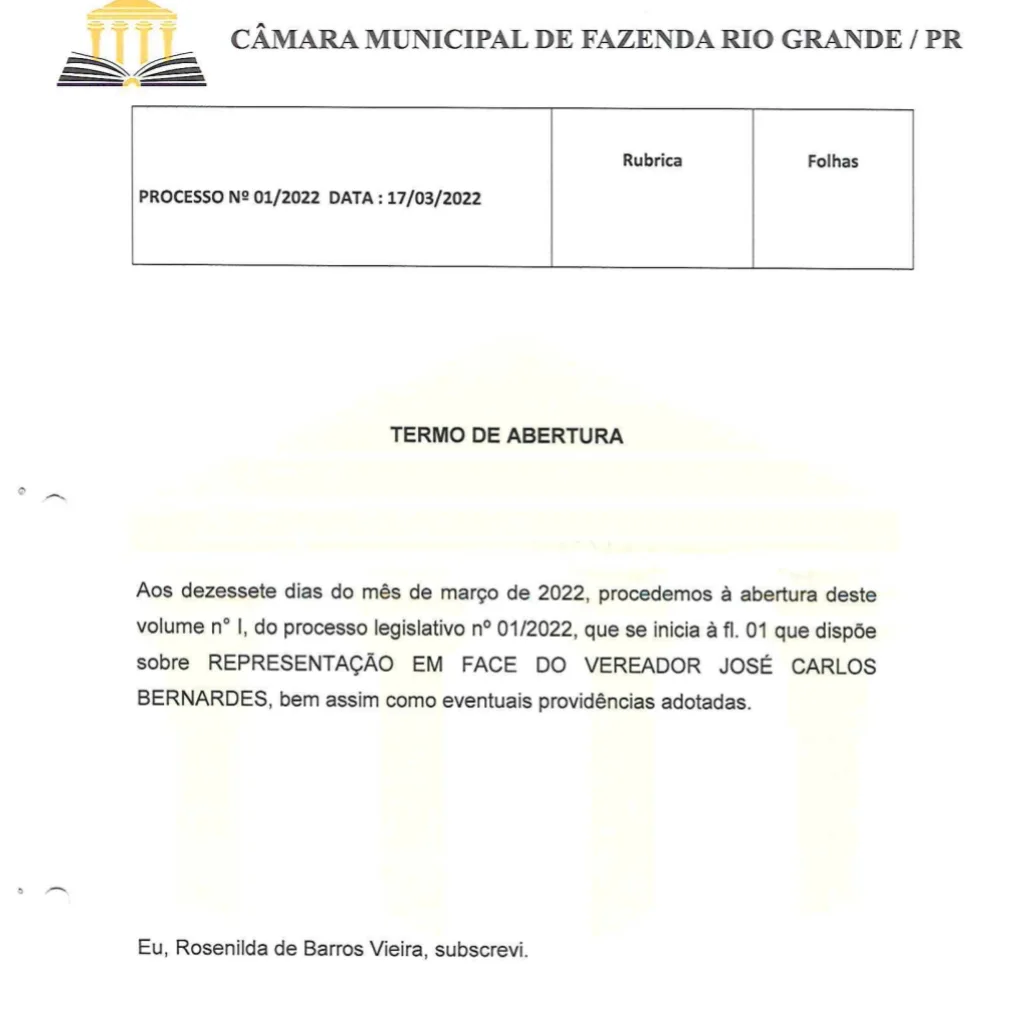 A ação no MP foi instaurada em 27 de agosto de 2021, pela 2ª Promotoria de Justiça de Fazenda Rio Grande, responsável pela Defesa do Patrimônio Público e da Probidade Administrativa, e foi assinada pelo promotor de Justiça Almir Carreiro Jorge.