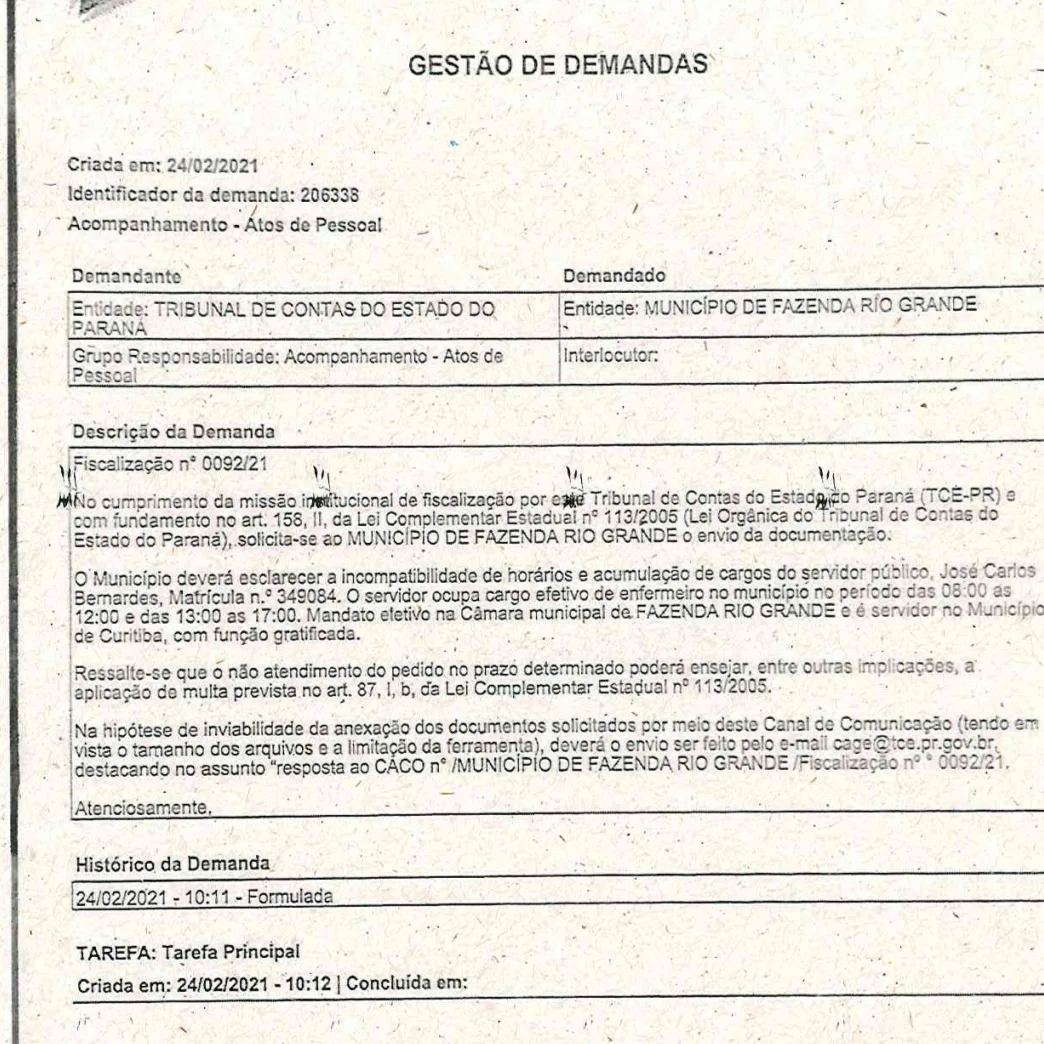 De acordo com apurações conduzidas pelo Portal IF, José Carlos Bernardes, popularmente conhecido por “Enfermeiro Zé Carlos”, foi empossado como vereador no município de Fazenda Rio Grande no dia 01 de janeiro de 2021. Todavia, o vereador exercia dois cargos de enfermeiro, um no município de origem e outro em Curitiba, porém, ele demorou mais de 70 dias para se licenciar de seu cargo de enfermeiro em Fazenda Rio Grande, exercendo três cargos públicos, em desacordo com o que diz o inciso XVI do artigo 37 da Constituião Federal, que permite apenas o acúmulo de dois cargos, com compatibilidade de horários, o que não era o caso.