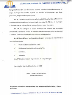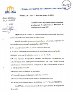A Câmara Municipal de Fazenda Rio Grande, realiza na próxima segunda-feira (30), a 2º votação do projeto de lei que ‘regulamenta’ a atividade de motoristas de aplicativo no município. O projeto é de autoria dos Vereadores Irmão José Miranda e Marco Marcondes, este, que foi eleito vice-prefeito nas eleições municipais deste ano [2020]. Confira a pauta aqui.