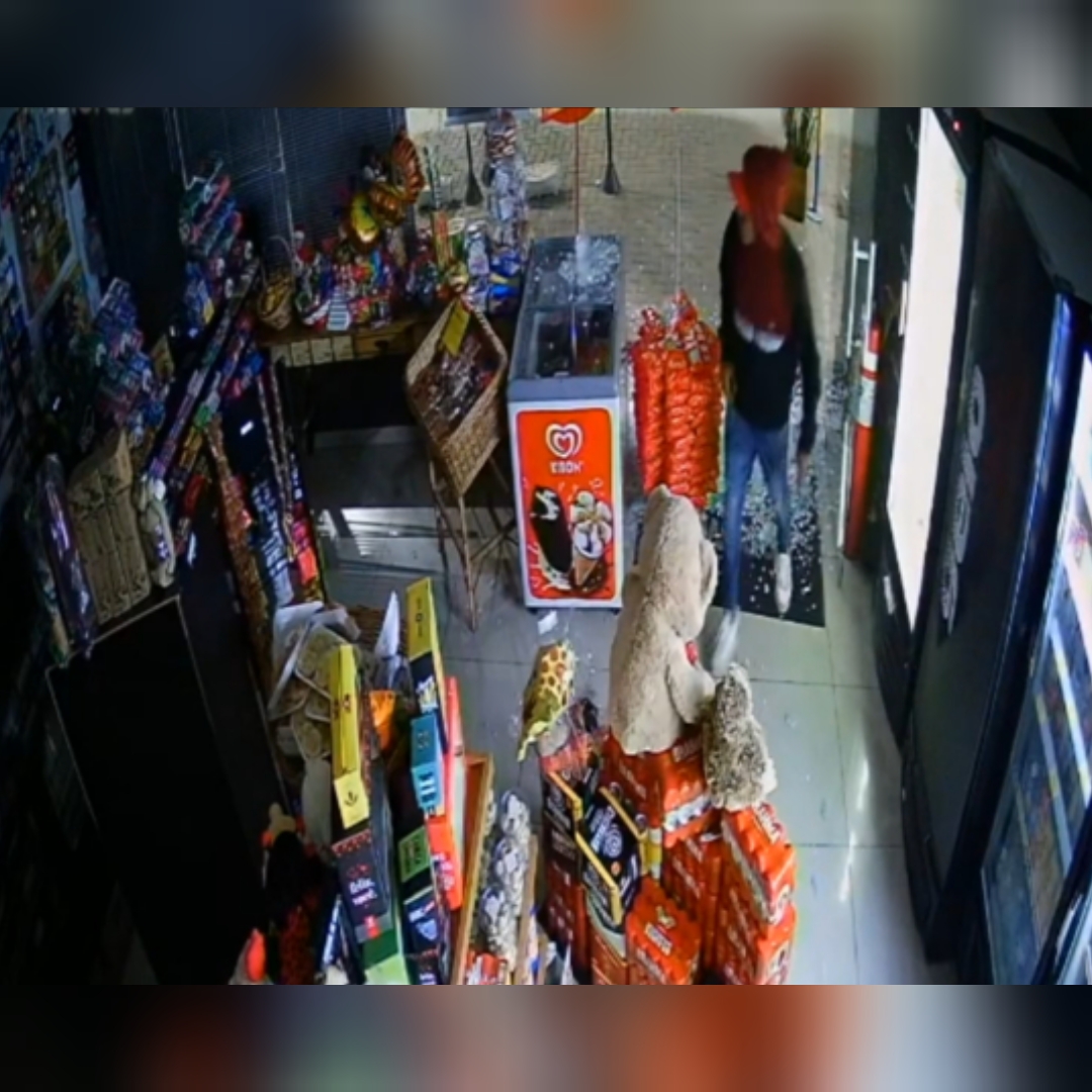 Nas imagens é possível ver o momento que um dos marginais quebra a porta de vidro da loja de conveniências com um chute. Na sequência, os outros dois criminosos também invadem a loja e vão em direção ao caixa.