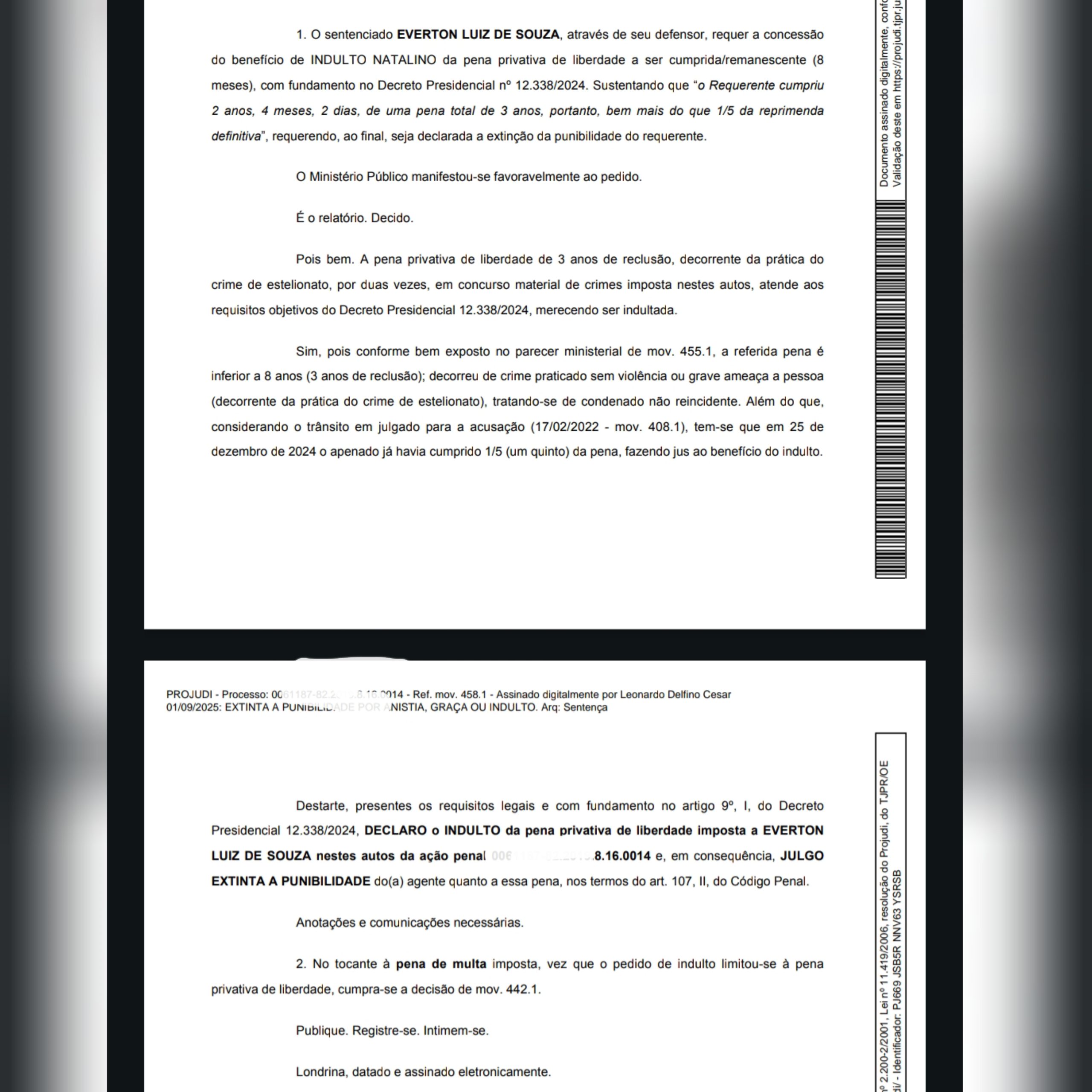A Justiça do Paraná concedeu indulto natalino e declarou extinta a punibilidade do advogado Everton Luiz de Souza, atual diretor financeiro da Câmara Municipal de Fazenda Rio Grande, condenado por estelionato em processo que tramitou na 2ª Vara Criminal de Londrina.