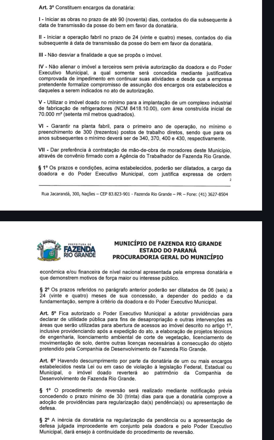 O PL também determina que no primeiro ano de operação seja aberto 300 postos de trabalho diretos, com preferência para moradores de Fazenda Rio Grande, através de convênio com a Agência do Trabalhador.