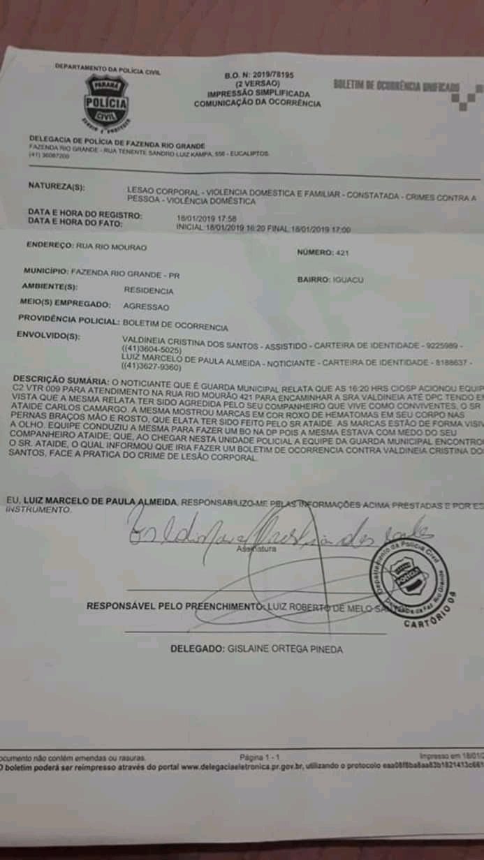 Segundo dados do Boletim de ocorrência, o inicio do caso foi em 15 de Janeiro deste ano. Porém, a mulher afirma que há 20 anos é agredida pelo ex companheiro. Inclusive, em uma recente postagem, ela mostrou fotos em que o homem supostamente “quebrou os seus dentes”. Ainda, conforme escreveu a empresária, ela é amparada por uma medida protetiva, mas teme por sua vida, pois, já foi ameaçada de morte por Ataíde.
