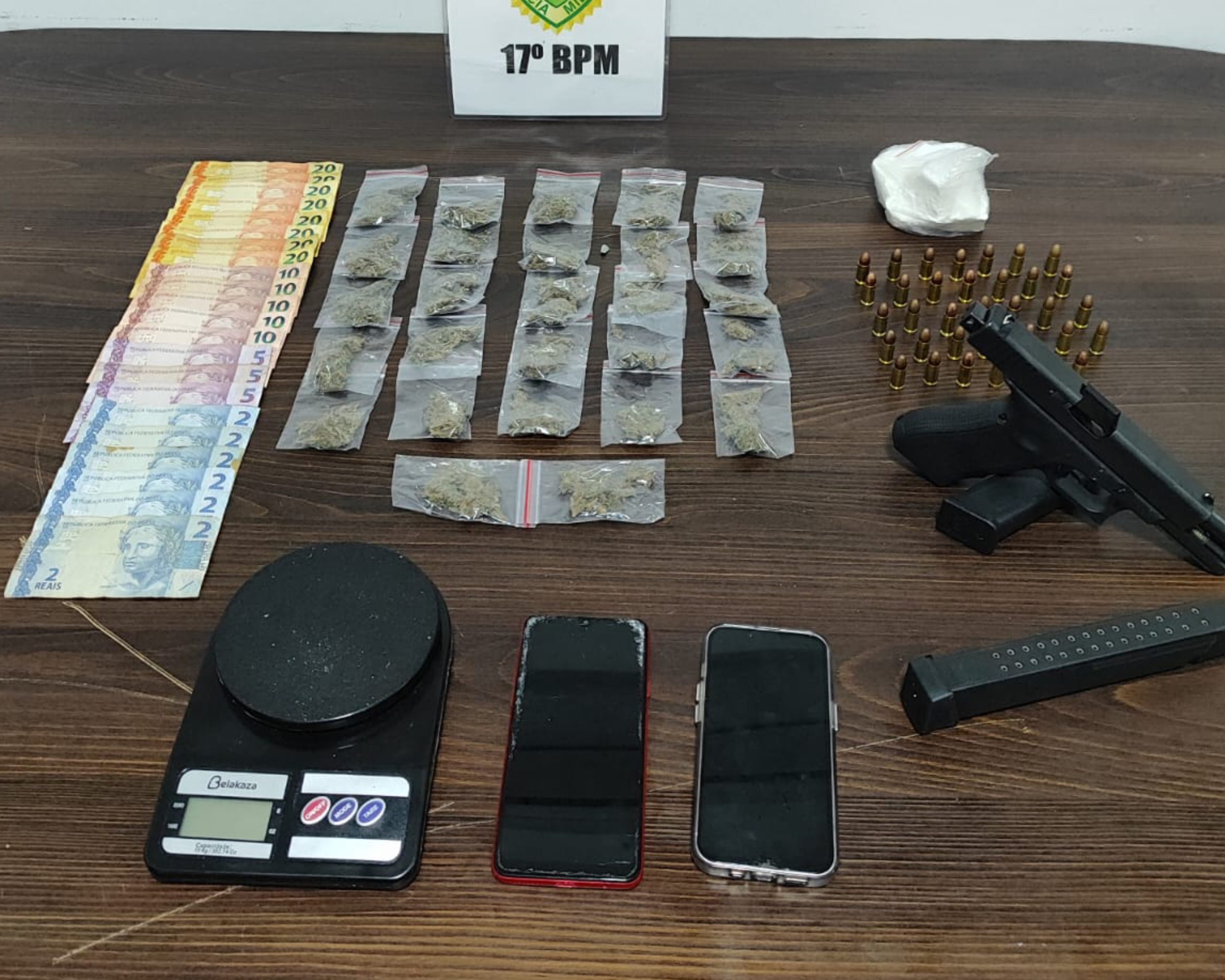 No interior da residência, os policiais localizaram ainda 55 gramas de maconha embaladas em 27 invólucros tipo ziplock, 235 gramas de cocaína em pedra, duas balanças de precisão, R$ 237 em espécie e dois celulares.
