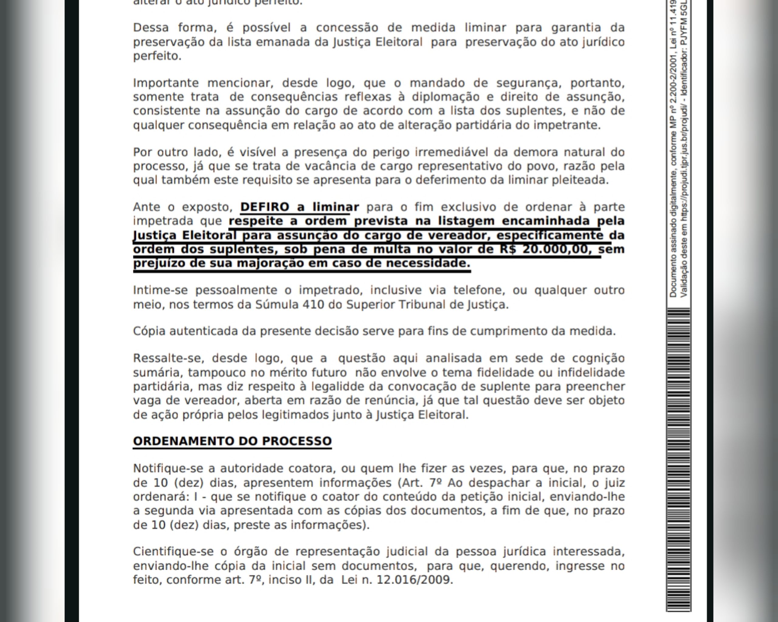 De acordo com a decisão, assinada pela juíz Pedro Roderjan, da Vara da Fazenda Pública de Fazenda Rio Grande, “a fusão de partidos ocorrida posteriormente não tem o condão de alterar as posições consumadas quando da eleição e posterior diplomação. A assunção do cargo deve observar a listagem encaminhada pela Justiça Eleitoral, originária às eleições. Ressalte-se que a mudança de partido não implica na perda de mandado no caso em tela, uma vez que aparentemente realidade dentro do período da janela partidária, na forma do art. 22-A, inciso III da Lei n. 9.096/95.”