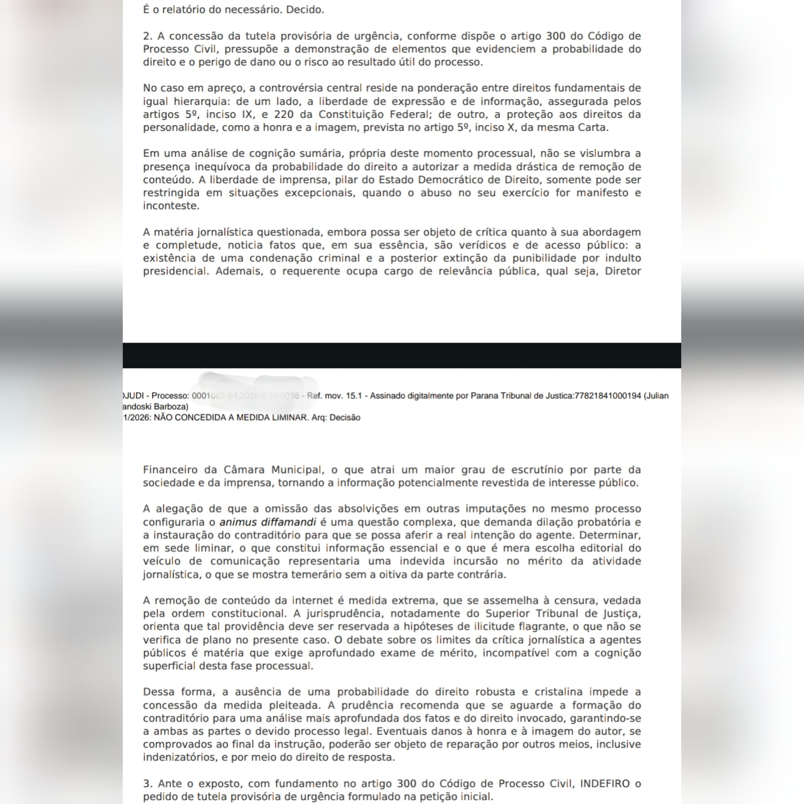 Ao analisar o pedido, a juíza entendeu que não havia elementos suficientes para retirar o conteúdo de forma urgente. Segundo a decisão, as publicações tratam de fatos reais, públicos e verificáveis, além de envolverem uma pessoa que ocupa cargo público, o que justifica maior interesse da sociedade e da imprensa.