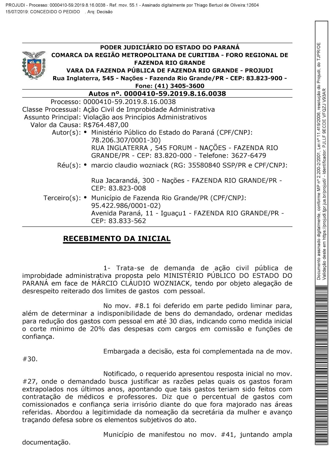 No recebimento inicial da ação, o Juiz descreve, “Pois bem, no caso dos autos há relevantes e suficientes indícios da imputação feita em face de MÁRCIO CLÁUDIO WOZNIACK, tanto é assim que a medida liminar foi deferida em sua maior parte.