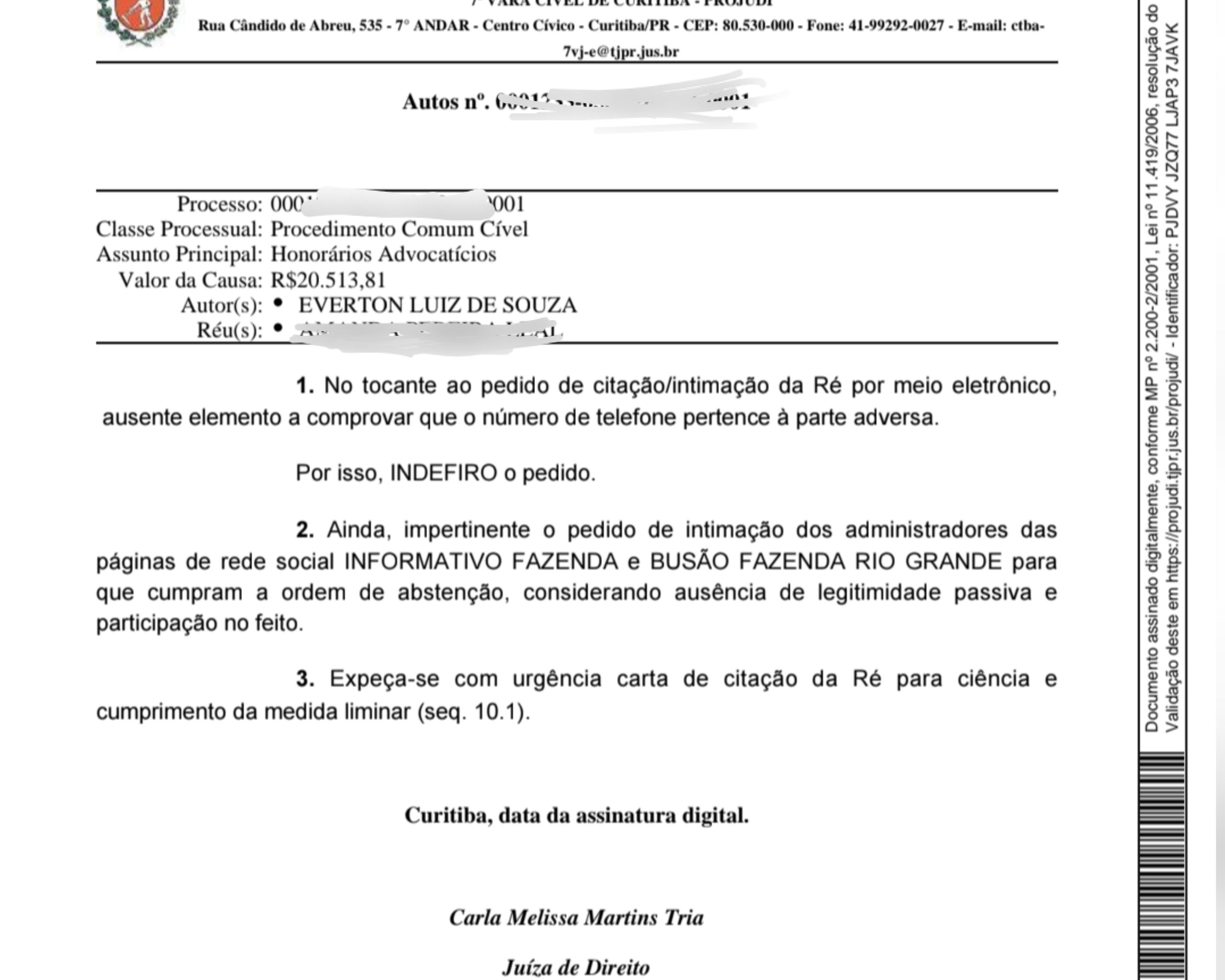 A Justiça do Paraná rejeitou pedidos formulados em uma ação judicial que buscava impedir o Informativo Fazenda de publicar conteúdos relacionados a um desacordo comercial envolvendo um advogado de Fazenda Rio Grande, e o recebimento de valores retroativos do Benefício de Prestação Continuada (BPC) destinados a uma criança autista