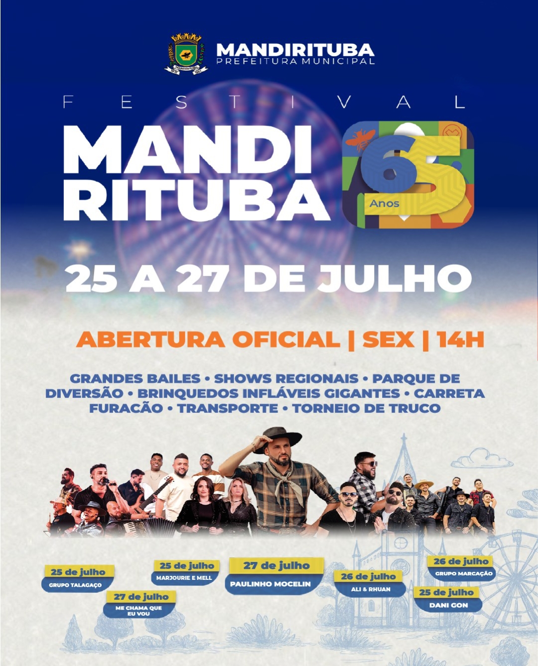 A cidade de Mandirituba, comemora 65 anos de emancipação política com uma grande festa popular. Entre os dias 25 e 27 de julho, o Parque Municipal de Eventos Ângelo Zeglin Palú será palco de shows gratuitos, parque de diversões, atividades infantis, praça de alimentação, transporte gratuito e diversas atrações para todas as idades.