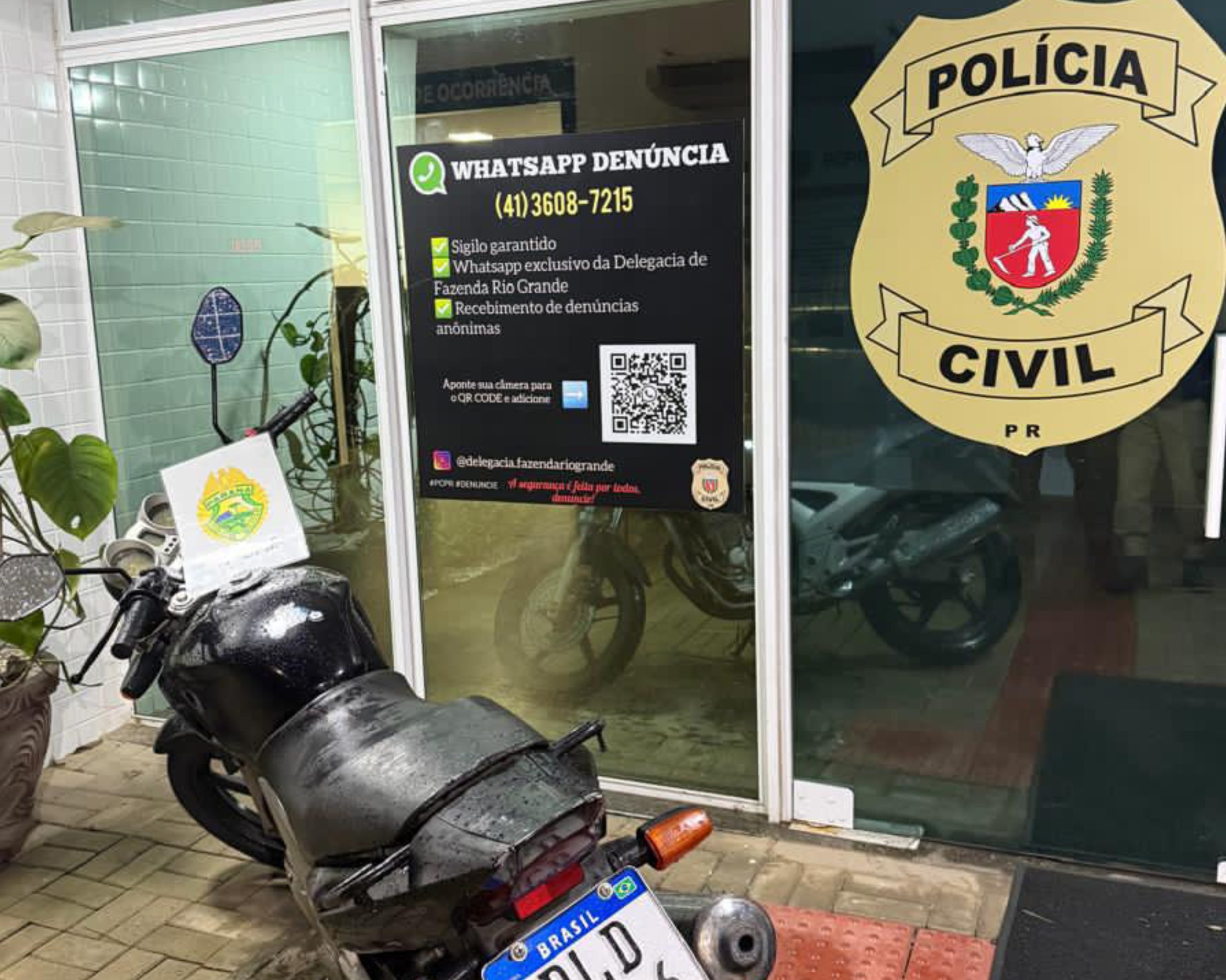 O homem recebeu voz de prisão e foi encaminhado, junto com a motocicleta, à Delegacia da Polícia Civil de Fazenda Rio Grande para as medidas cabíveis.