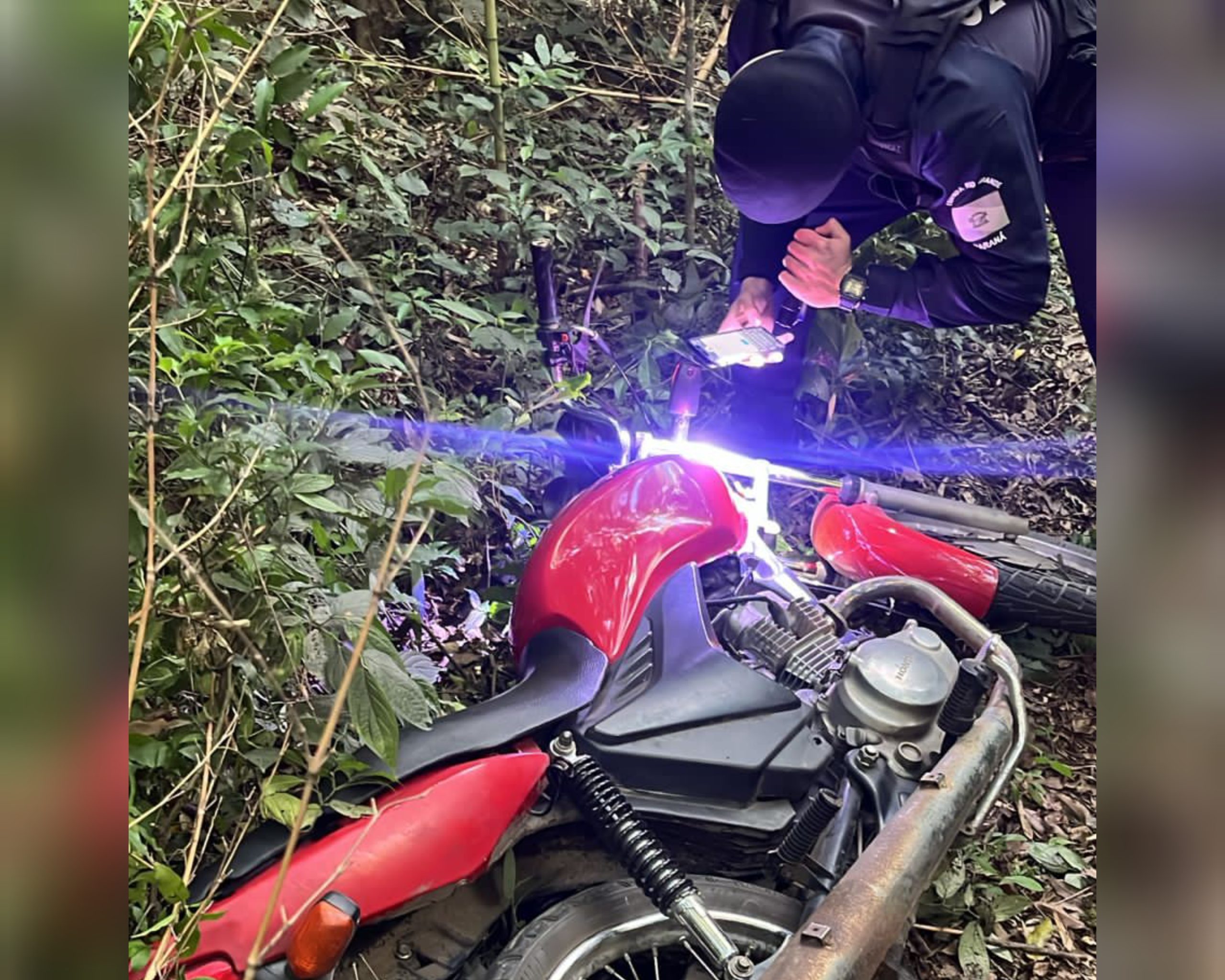 Ainda no local, os agentes constataram que o miolo da chave havia sido estourado, o que possibilitou o funcionamento do veículo. A motocicleta foi retirada da área de mata e, sob escolta de duas viaturas, encaminhada até a Delegacia de Polícia de Fazenda Rio Grande.