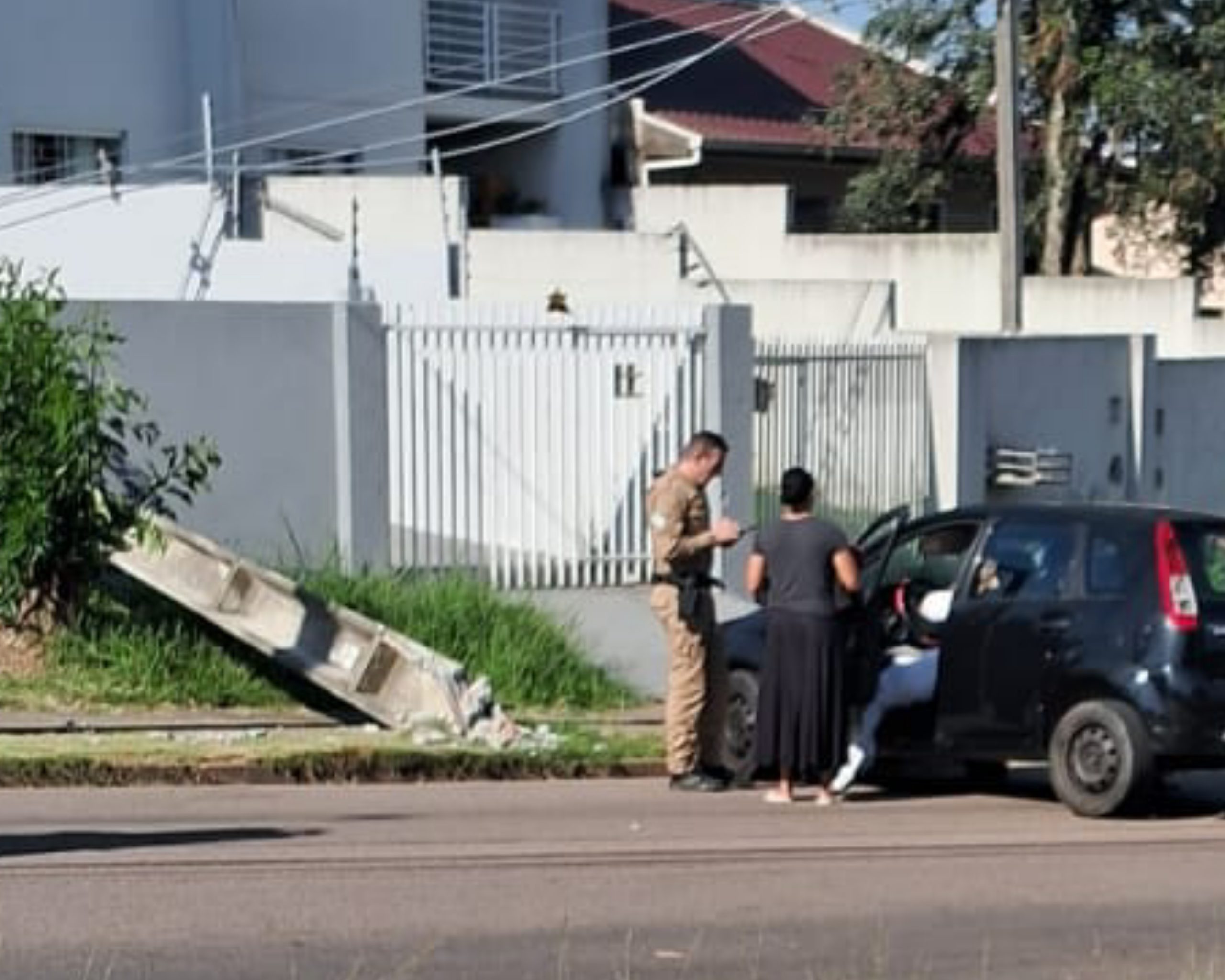Uma motorista perdeu o controle da direção do veículo que dirigia, bateu e derrubou um poste de energia elétrica, na manhã desta quinta-feira (27), em Fazenda Rio Grande.