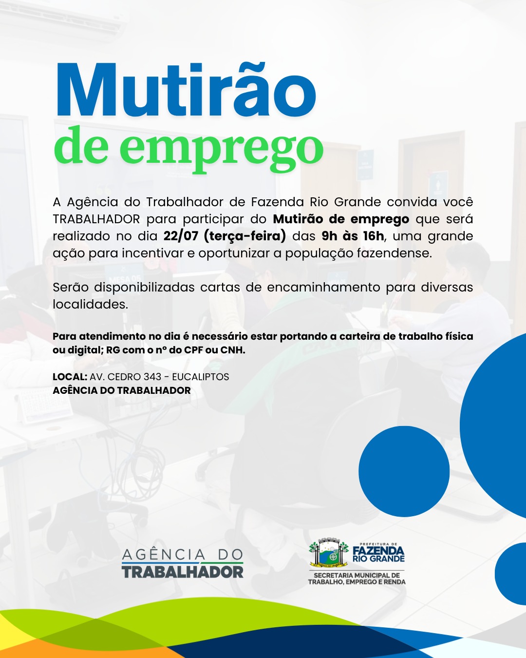 A Agência do Trabalhador de Fazenda Rio Grande realiza nesta terça-feira, dia 22 de julho, um grande Mutirão de Emprego, com mais de 200 vagas disponíveis para a população. A ação acontece das 9h às 16h, na sede da Agência do Trabalhador, localizada na Avenida Cedro, número 343, no bairro Eucaliptos.