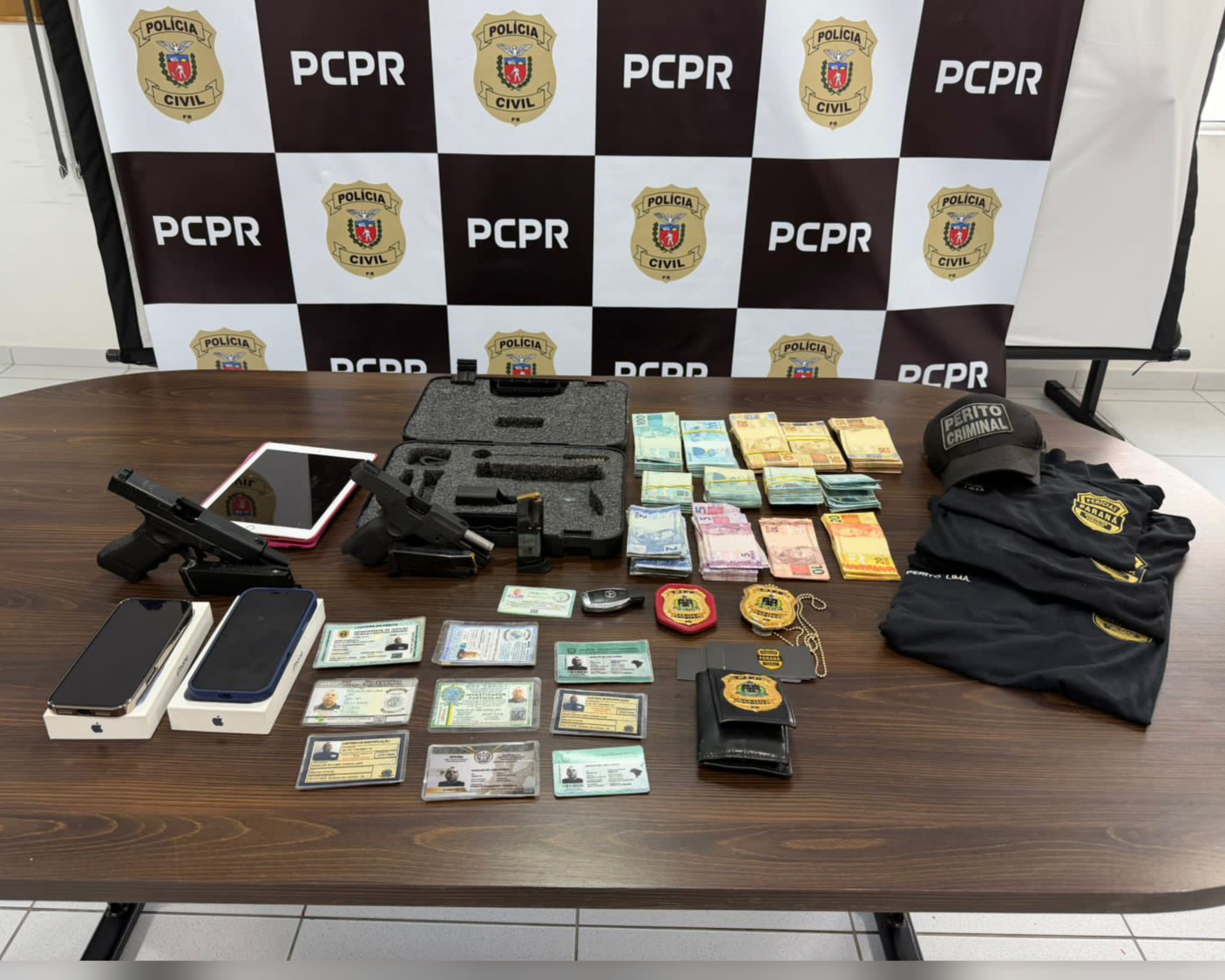 Na residência alvo da operação, as equipes localizaram e apreenderam uma arma de fogo calibre 9 mm, municiada e com dois carregadores, além de um simulacro de arma de fogo. Também foram encontrados distintivos, camisetas e coletes balísticos com inscrições de “Perícia Criminal”, utilizados para simular uniformes oficiais, bem como diversos documentos e mais de R$ 56 mil em dinheiro, sem comprovação de origem lícita.