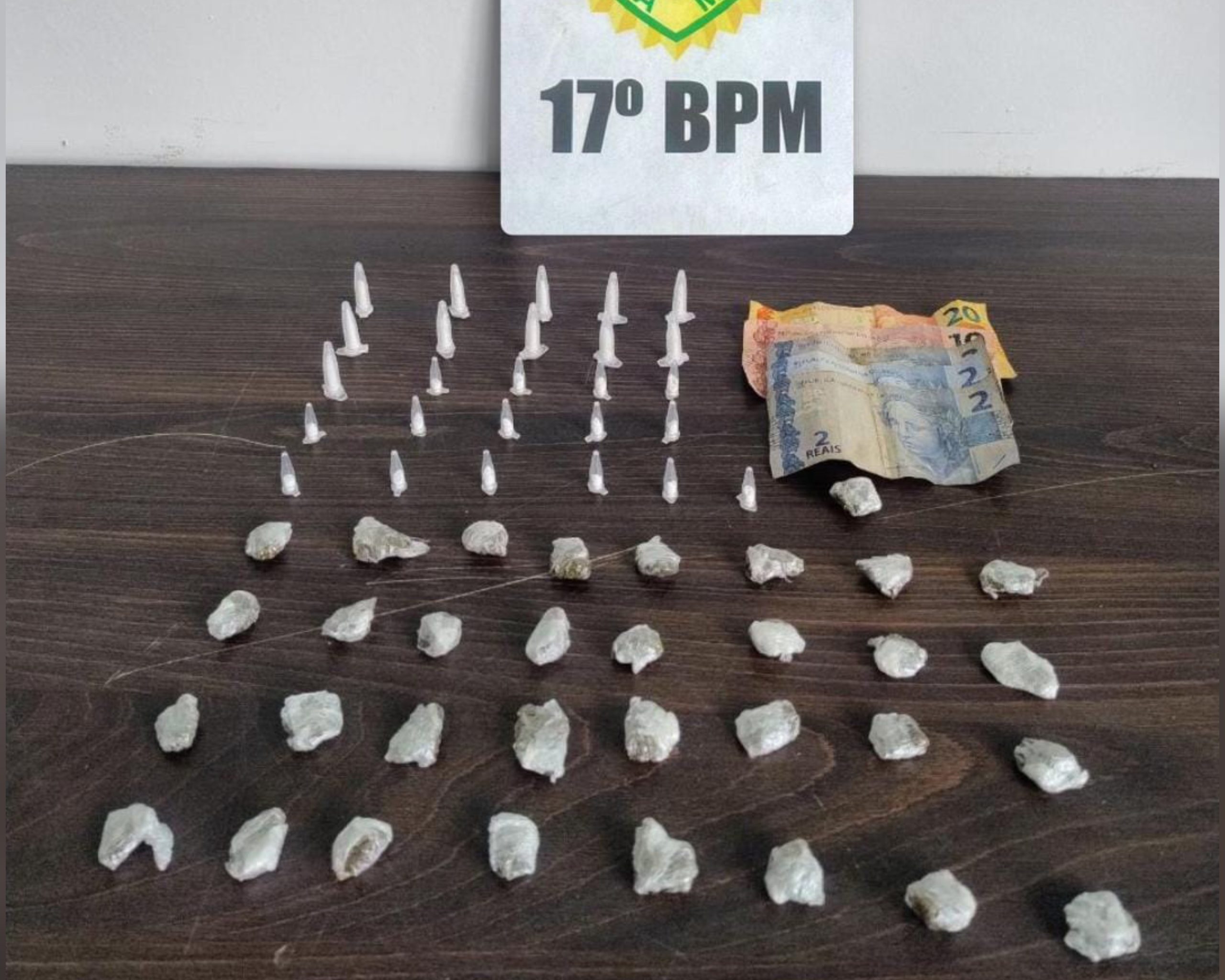Com a chegada de reforço, o suspeito foi abordado. Nada de ilícito foi encontrado em sua posse, porém, durante a varredura no terreno baldio, os policiais localizaram 33 buchas de maconha e 26 eppendorfs de cocaína já fracionadas para venda.