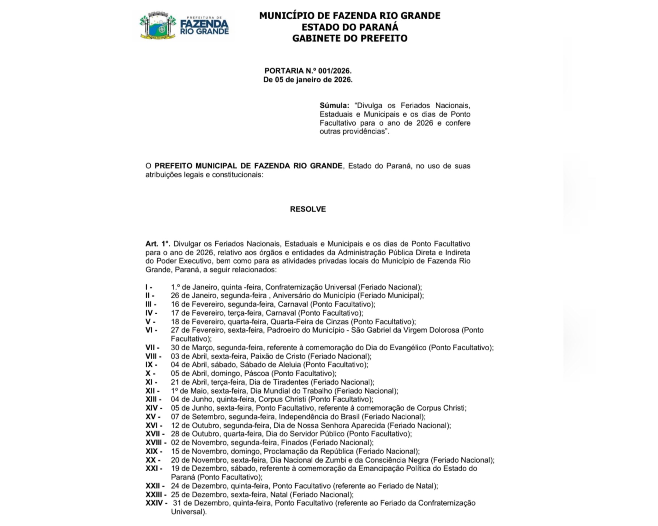 A Prefeitura de Fazenda Rio Grande publicou nesta segunda-feira (5) a Portaria nº 001/2026, que estabelece o calendário oficial de feriados nacionais, estaduais, municipais e os dias de ponto facultativo para o ano de 2026.