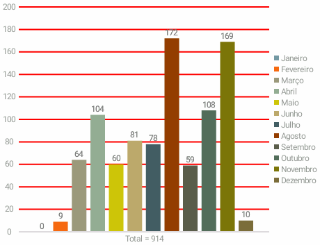 Os meses de agosto e novembro tiveram os maiores índices, com 172 diárias, equivalentes a R$ 101.733,45 e 169 diárias somando R$ 75.498,89 respectivamente. Já em janeiro não houve utilização e fevereiro e dezembro o uso foi muito pouco.