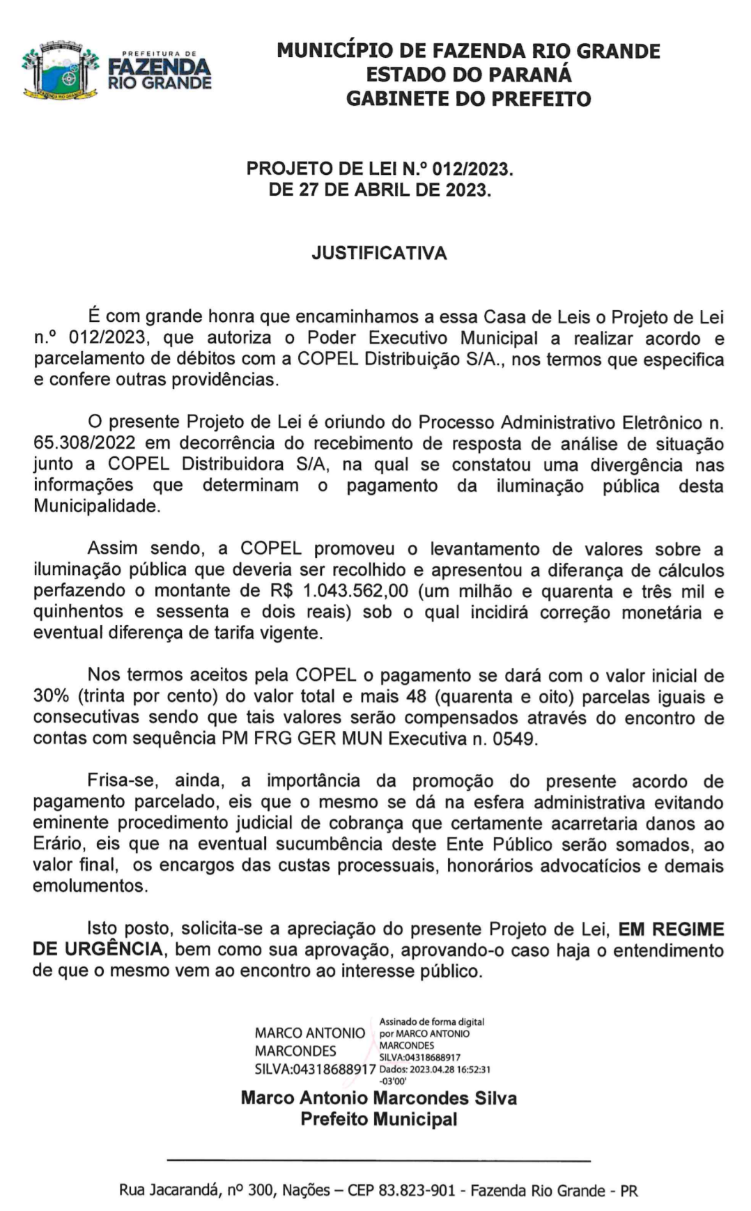 A Prefeitura de Fazenda Rio Grande pediu através do Projeto de Lei 012/2023, que a Câmara Municipal de Vereadores, autorize o parcelamento de valores relacionados à iluminação pública no município. O valor da dívida é um pouco mais de R$ 1 milhão com a Copel.