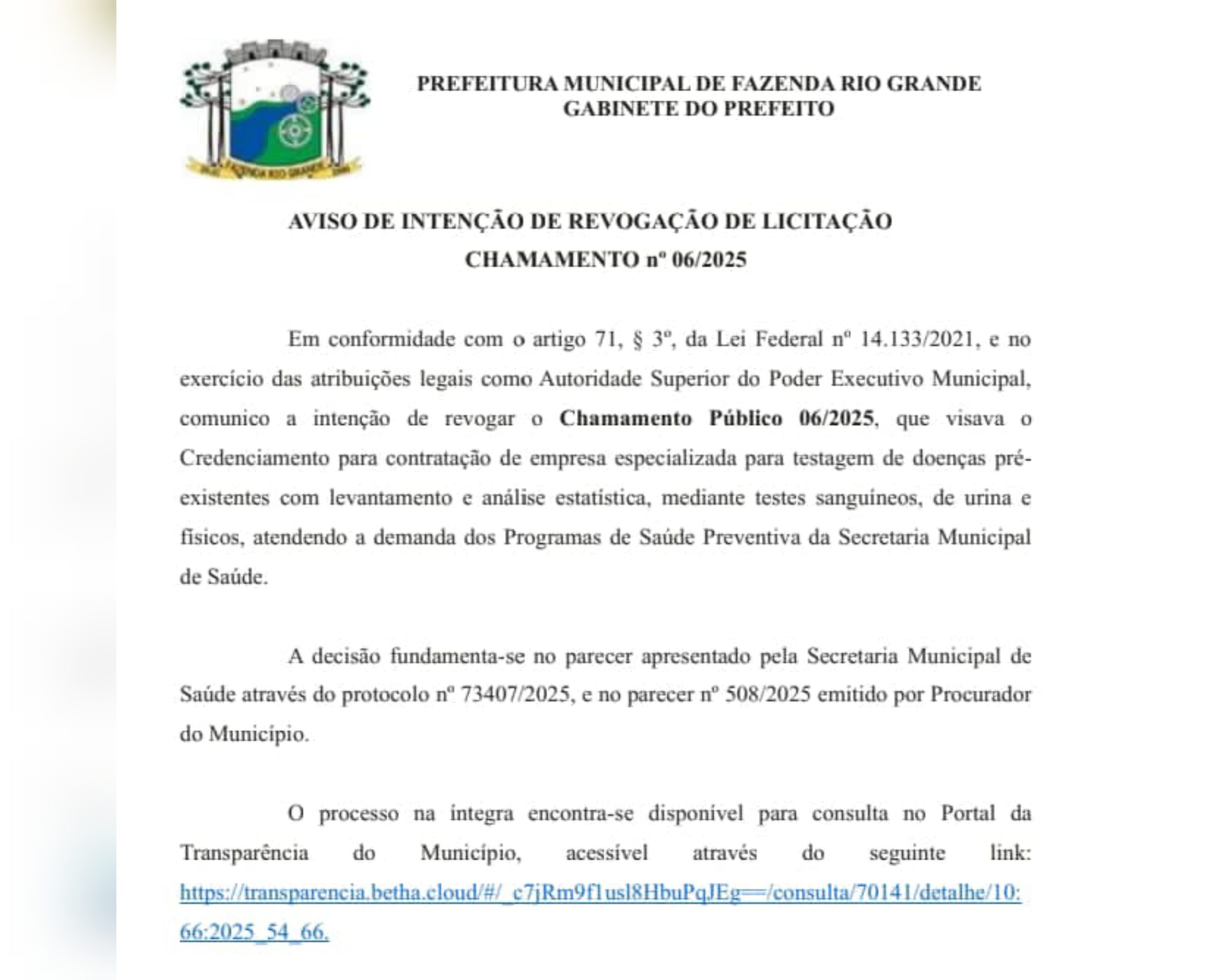 A Prefeitura de Fazenda Rio Grande (PR) publicou nesta segunda-feira (13) a revogação do Chamamento Público nº 06/2025, que previa o credenciamento da empresa AGP Saúde, que fazia testes para detecção de doenças pré-existentes. A medida foi tomada após a identificação de irregularidades e a constatação de que a empresa interessada já está sob investigação do Ministério Público acompanhado pelo Tribunal de Justiça, por suspeita de fraude na saúde do município.
