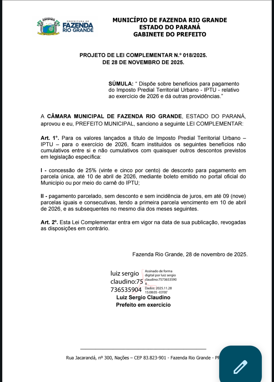 A Prefeitura de Fazenda Rio Grande apresentou, em regime de urgência, nesta semana um projeto que altera as regras de pagamento do Imposto Predial e Territorial Urbano (IPTU) para o exercício de 2026. A proposta, que ainda está sendo discutida na Câmara Municipal, elimina o tradicional desconto de 10% oferecido aos contribuintes que optavam pelo pagamento do imposto em três parcelas.