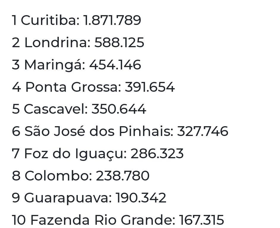 Os dados também mostram que Fazenda Rio Grande é a 10° maior cidade do estado em população, a frente de outros 389 municípios. Dos municípios da região, além da capital Curitiba, apenas São José dos Pinhais e Colombo estão a frente, com 1,8 milhões, 327,7 mil e 238,7 mil habitantes, respectivamente. Veja a lista das 10 maiores cidades do estado:
