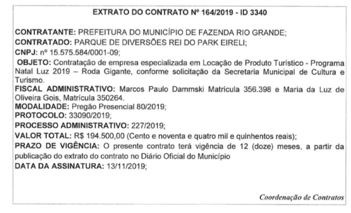 Extrato do contrato / Diário Oficial de Fazenda Rio Grande