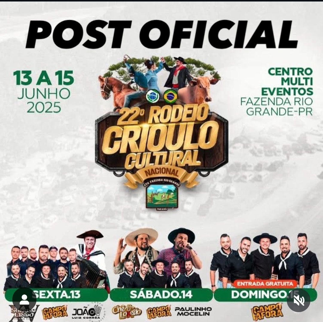 Fazenda Rio Grande se prepara para um fim de semana de tradição, cultura e muita emoção. O município recebe a 22° edição do Rodeio Crioulo, evento que promete reunir amantes da cultura gaúcha nos dias 14, 15 e 16 de junho, no Parque Multi-eventos.