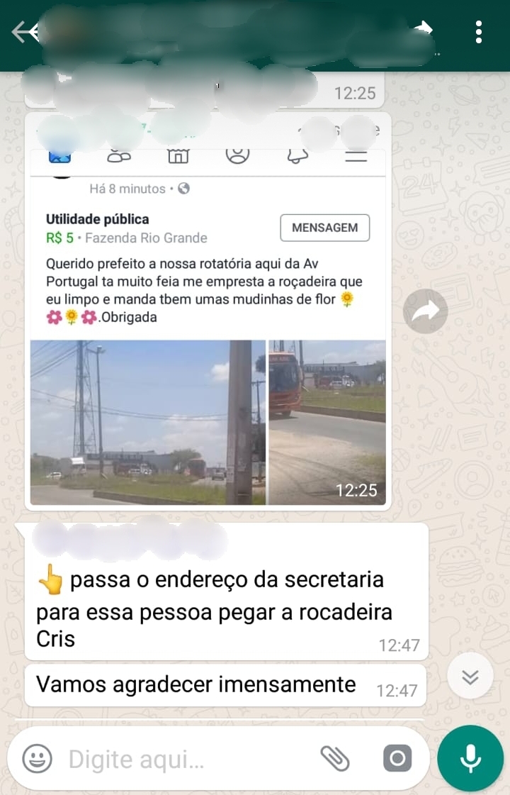 Uma moradora que fez uma postagem em um grupo de facebook de Fazenda Rio Grande, pedindo manutenção e limpeza em uma rotatória que divide as Avenidas Brasil e Portugal, no bairro Nações, foi supostamente zombada pelo Secretário Municipal responsável pela pasta.
