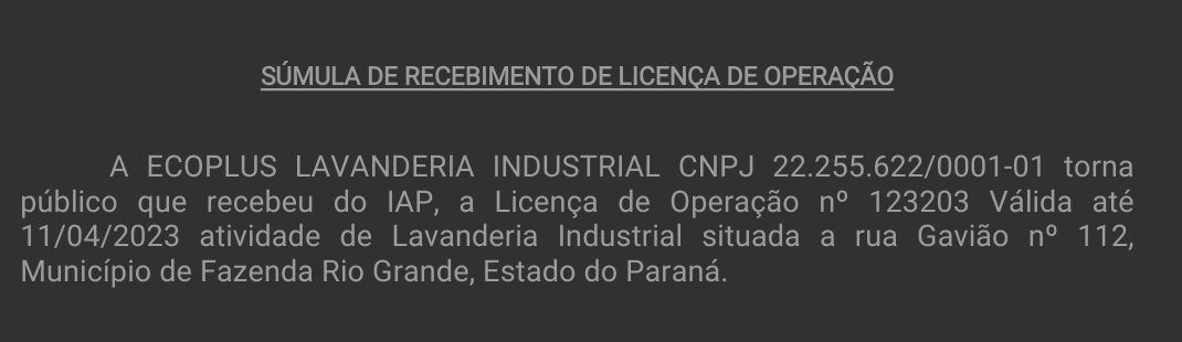 A ECOPLUS LAVANDERIA INDUSTRIAL CNPJ 22.255.622/0001-01 torna público que recebeu do IAP, a Licença de Operação nº 123203 Válida até 11/04/2023 atividade de Lavanderia Industrial situada a rua Gavião nº 112, Município de Fazenda Rio Grande, Estado do Paraná.