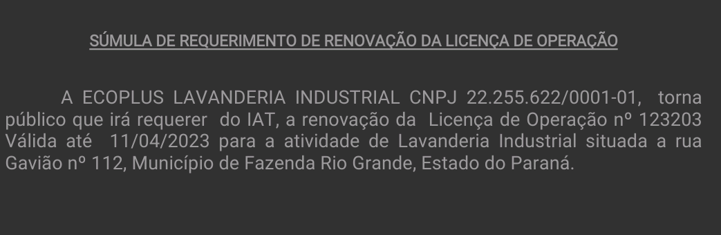 A ECOPLUS LAVANDERIA INDUSTRIAL CNPJ 22.255.622/0001-01, torna público que irá requerer do IAT, a renovação da Licença de Operação nº 123203 Válida até 11/04/2023 para a atividade de Lavanderia Industrial situada a rua Gavião nº 112, Município de Fazenda Rio Grande, Estado do Paraná.