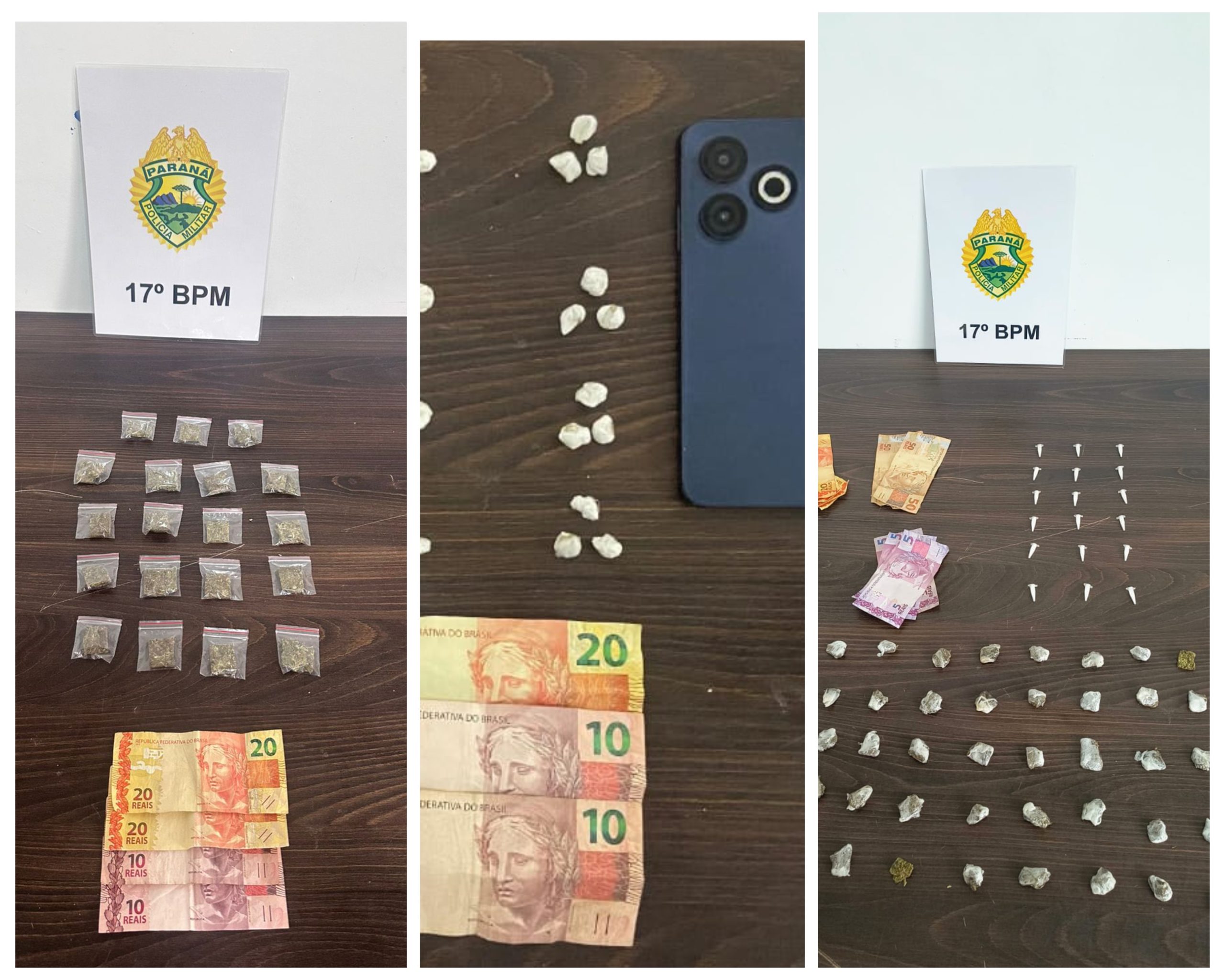Já no bairro Gralha Azul, os policiais prenderam um suspeito em flagrante após ele tentar se esconder em um supermercado ao ver a viatura. Durante a abordagem, os agentes localizaram com ele 19 porções de maconha e R$ 60,00 em cédulas diversas. Uma busca nas proximidades resultou na apreensão de uma sacola com mais entorpecentes.