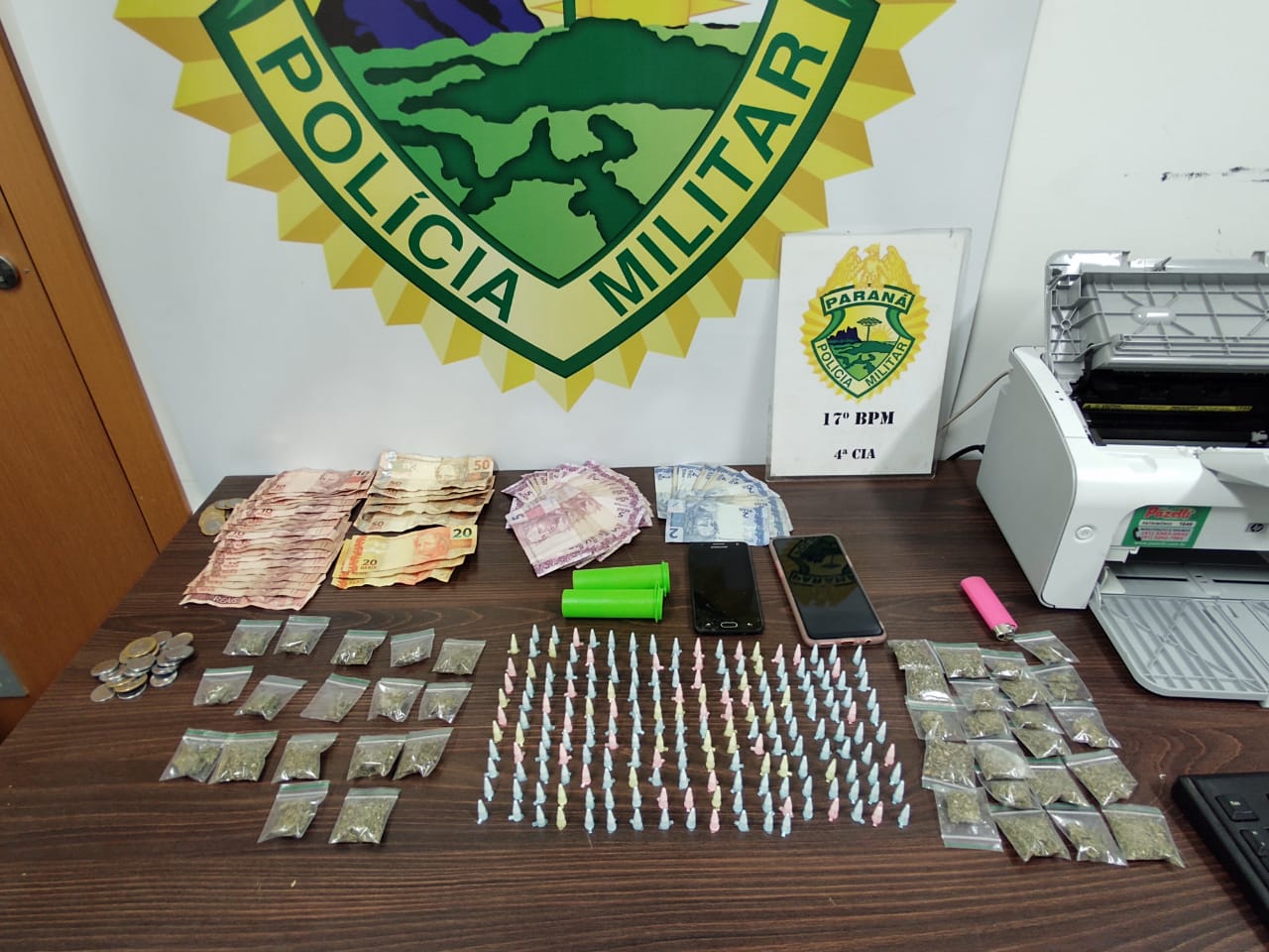 Segundo a PM, os Policiais teriam flagrado a comercialização de drogas e durante a abordagem uma senhora, mãe de um dos suspeitos, saiu de dentro da residência e tentou jogar uma sacola com drogas, porém, não teve sucesso. Dentro de um cômodo da casa, mais drogas para comercialização, e dinheiro em espécie foram localizados.