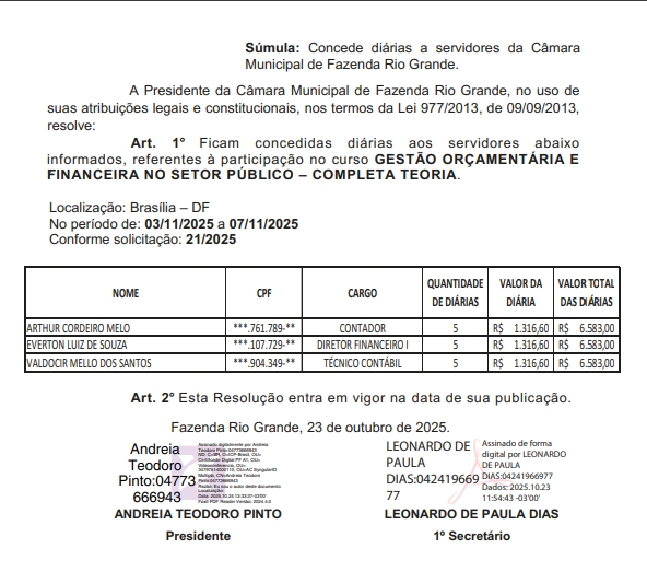 A Câmara Municipal de Fazenda Rio Grande publicou a Resolução nº 024/2025, que paga quase R$ 20 mil em diárias para três servidores irem à Brasília, capital federal. De acordo com a justificativa, a viagem é para participação em um curso de capacitação em Gestão Orçamentária e Financeira no Setor Público