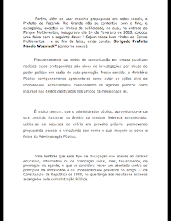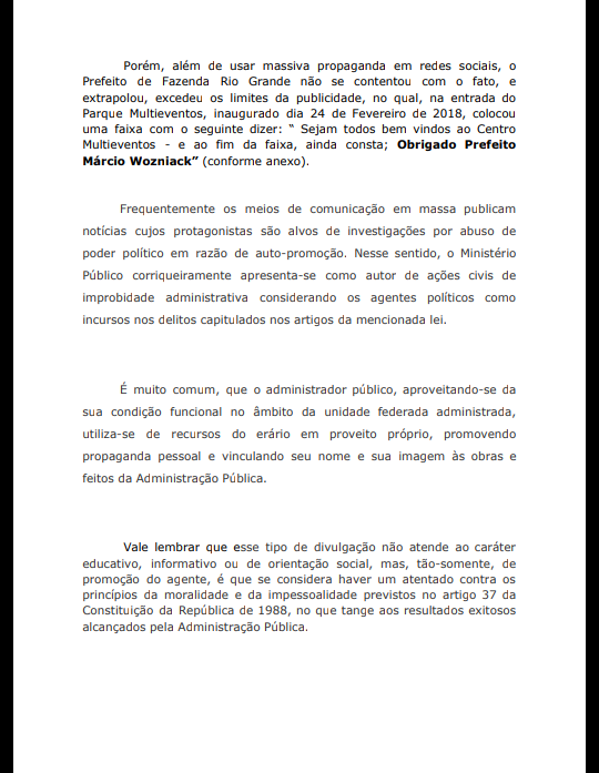 A ação questionava a suposta auto-promoção do prefeito da cidade de Fazenda Rio Grande por ter uma placa de agradecimento em um parque local, onde a obra é pública, e foi feita com o dinheiro do povo. Utilizando o Art°37 da Constituição Federal que veda a auto-promoção em dos seus incisos, o documento foi encaminhado ao Tribunal e teve como relator o Conselheiro Fábio Camargo que alega: ” (…) não tem indícios de ilegalidade e irregularidade, não consta provas do alegado, apenas uma foto, determino o encerramento e arquivo (…)”, concluiu o conselheiro.