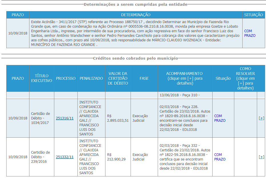 O Acórdão 5938/15, oriundo do processo 251316/11, de 09 de Dezembro de 2015, “considerou irregular a prestação de contas da transferência voluntária celebrada entre o Poder Executivo do Município de Fazenda Rio Grande e a Organização da Sociedade Civil de Interesse Público Instituto CONFIANCCE, de responsabilidade do Senhor Francisco Luís dos Santos, ex-prefeito municipal, e da Senhora Cláudia Aparecida Gali, presidente da entidade, formalizada por meio do Termo de Parceria n° 15/2010, no valor de R$ 1.815.404,83 (um milhão oitocentos e quinze mil quatrocentos e quatro reais e oitenta e três centavos), referente ao exercício financeiro de 2010, tendo por objeto ações na área de atenção básica à saúde municipal, o desenvolvimento do Projeto Saúde da Família – PSF, o Programa Agentes comunitários de Saúde – PAC e de Agentes de Combate à